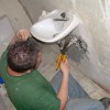 Na een eerste onderzoek bleek dat de muur niet al te stevig was (en dit is echt wel een understatement). Hij zat niet eens vast in de muur en bovenaan zat hij gewoon tussen 2 balken. 1 duw en alles lag omver. Daardoor duurde het afbreken uiteraard wel langer, omdat we heel voorzichtig te werk moesten gaan. David had ondertussen al vakkundig het toilet en de lavabo verwijdert uit onze lange-gang-wc zodat we snel konden beginnen met het slopen van de muur.