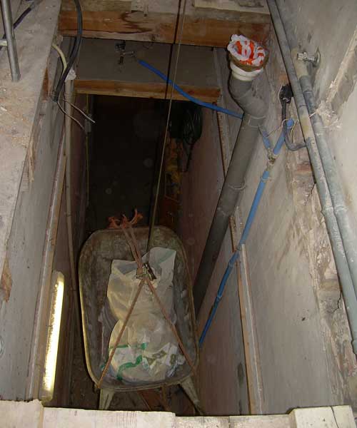 Aan het begin van de dag hadden we een gat in de vloer gemaakt zodat onze katrol optimaal kon gebruikt worden. Die elektrische katrol konden we dan heel gemakkelijk gebruiken om een zak of 3 met stenen en kalk via een kruiwagen naar beneden te laten, rechtstreeks in onze gang (=> deze gang is gewoon een doorgang van onze 2de voordeur naar de tuin, gemakkelijk als je afval hebt moet je niet door gans het huis) Dit scheelde toch een pak sleur en trekwerk, als het gemakkelijk kan moet je het ook niet laten he. Na het uitbreken van de vloer dan overgegaan naar het afbreken van de valse plafond die er nog onder zat. Was een redelijk stuntwerk, waarbij David’s pa letterlijk op de randen gryproc stond.